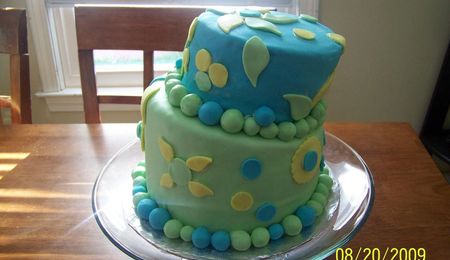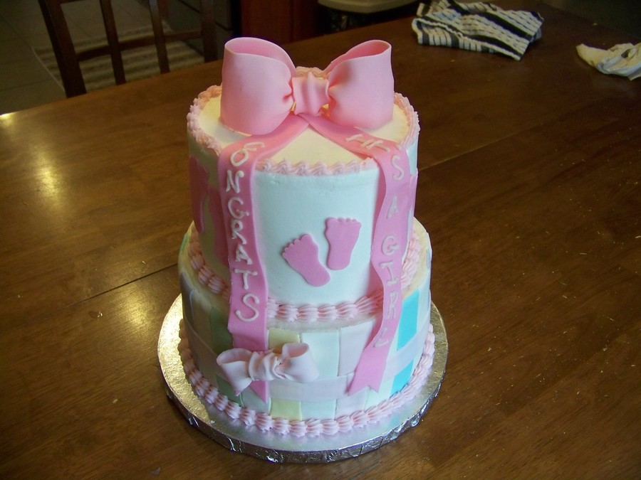 Baby girl shower cake. Got the napkin as inspiration...learned a few things--as I do every cake I do! 6" is SugarShack's buttercream (how I LOVE that stuff!) 8" is fondant accents...fondant bow etc...