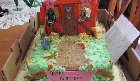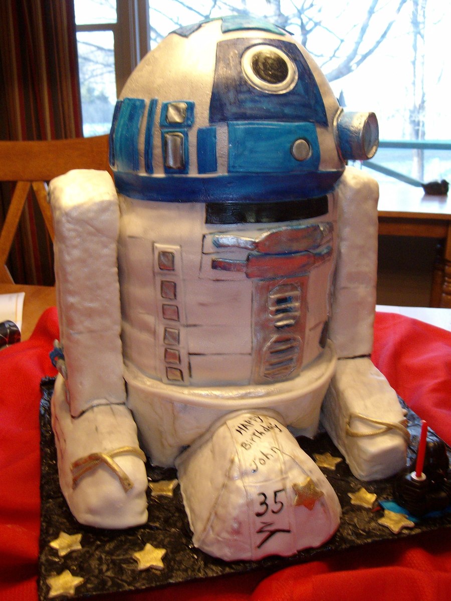 My First Big 3D cake.Chocolate cake peanutbutter cream filling,Yellow cake raspberry cream filling.The legs are crispy cereal.covered and detailed with mmf.This was my sons 35 b-day cake, I also cut out the musical piece from a Star Wars card.,and played that as he blew out the Darth Vader candel.