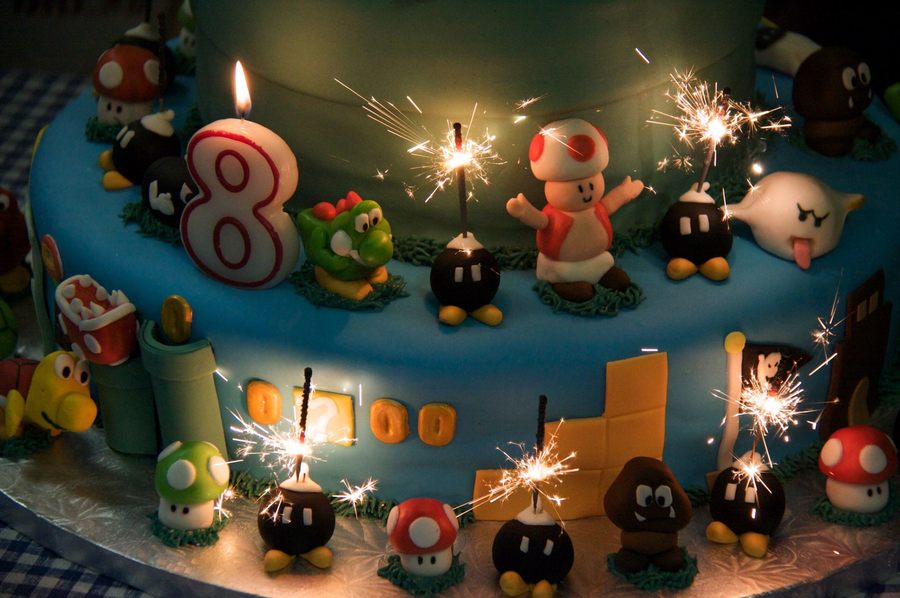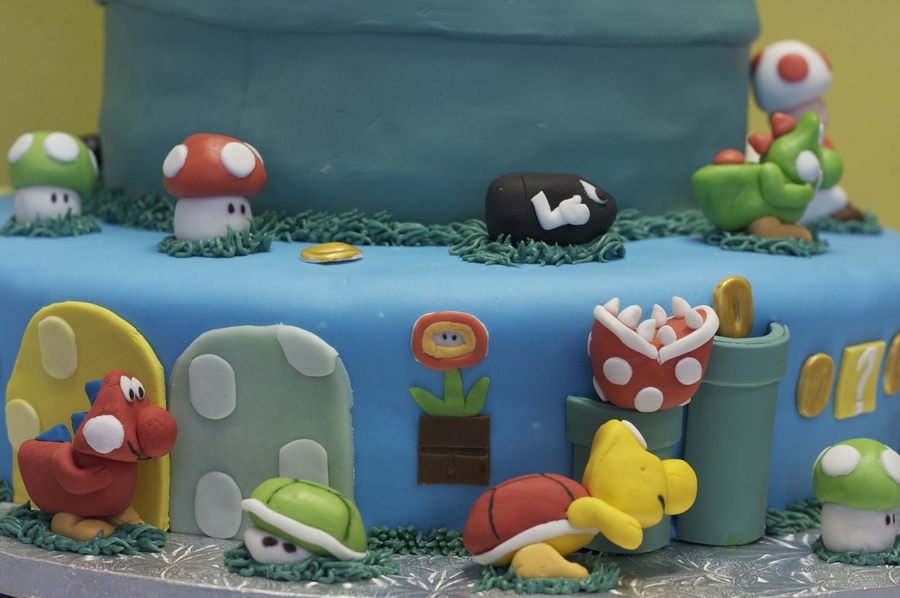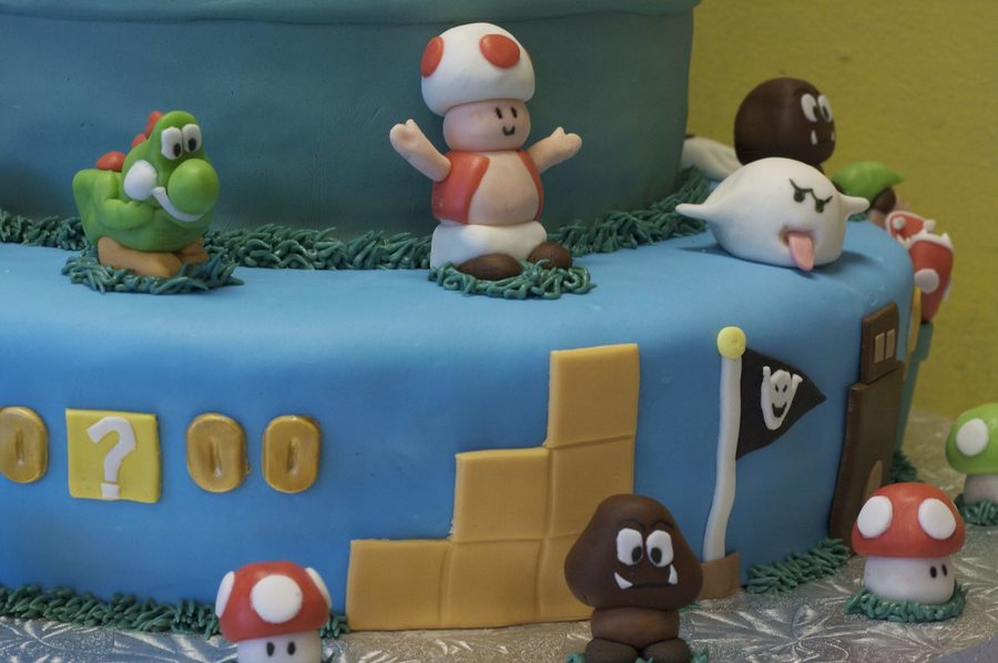 I made this cake for my son's birthday. I used a 14" and 9" round cake for the bottom two teirs. For Mario I used a ball pan for his head and a small 7" (I think) round for his body. I rounded the top for his shoulders. I used a picture as a template for the facial features. I made all the figures out of fondant. The head started to tilt. That was the only problem. This was my first attempt at something like this. I was quite pleased with the result. Thanks for all the great ideas on CC!
