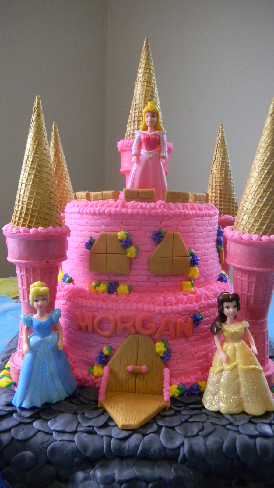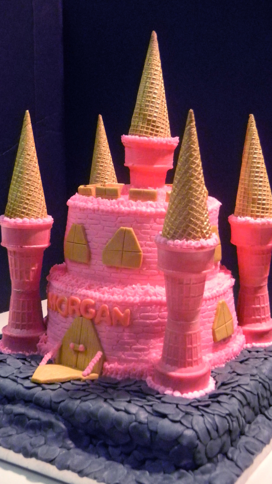Castle cake. Bottom rock layer is white cake with vanilla buttercream covered in fondant rocks. Castle is chocolate cake with vanilla buttercream. Ice cream cones filled and covered in white chocolate airbrushed pink/gold. Princesses are not edible and were the gift for the birthday girl. I thought she would like to keep them instead of eating them. ;)