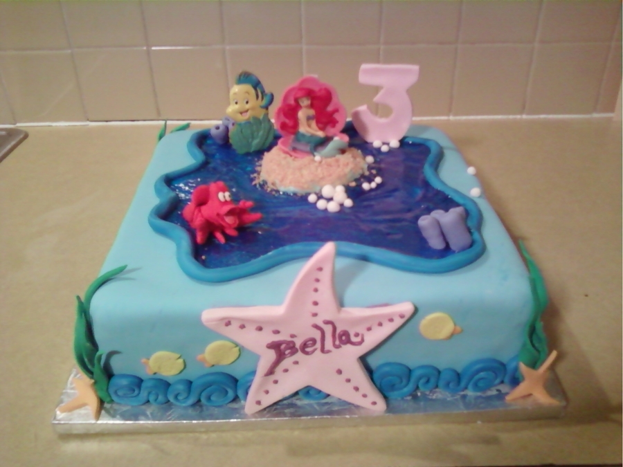Choc/Van cake covered in BC and all fondant accents. Water is blue glitter gel. I made Sebastian from Fondant/gumpaste and he came perfect, I was thrilled!! Could not get Flounder so had to buy him! Little girl LOVED it