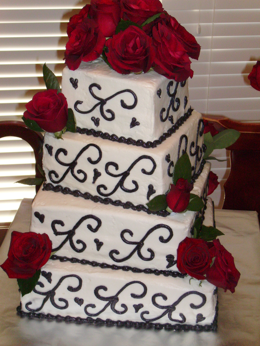 Sour cream white wedding cake torted and filled with buttercream icing. Hand piped icing scrolls. Fresh/live flowers.