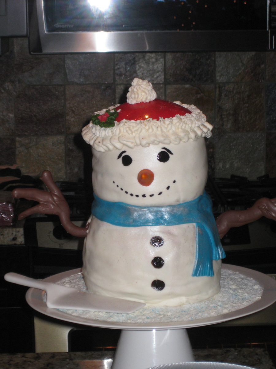 Carved snowman cake. The bottom cake is an 8inch chocolate round, and the top is a 6inch vanilla round cake. Both filled with butter cream and covered in MMF. The "branches" are made of milk chocolate.