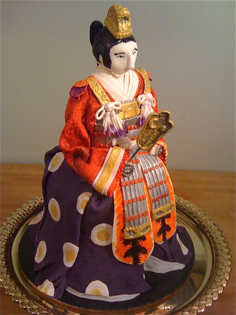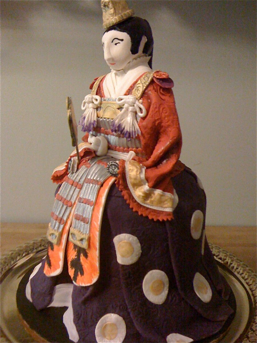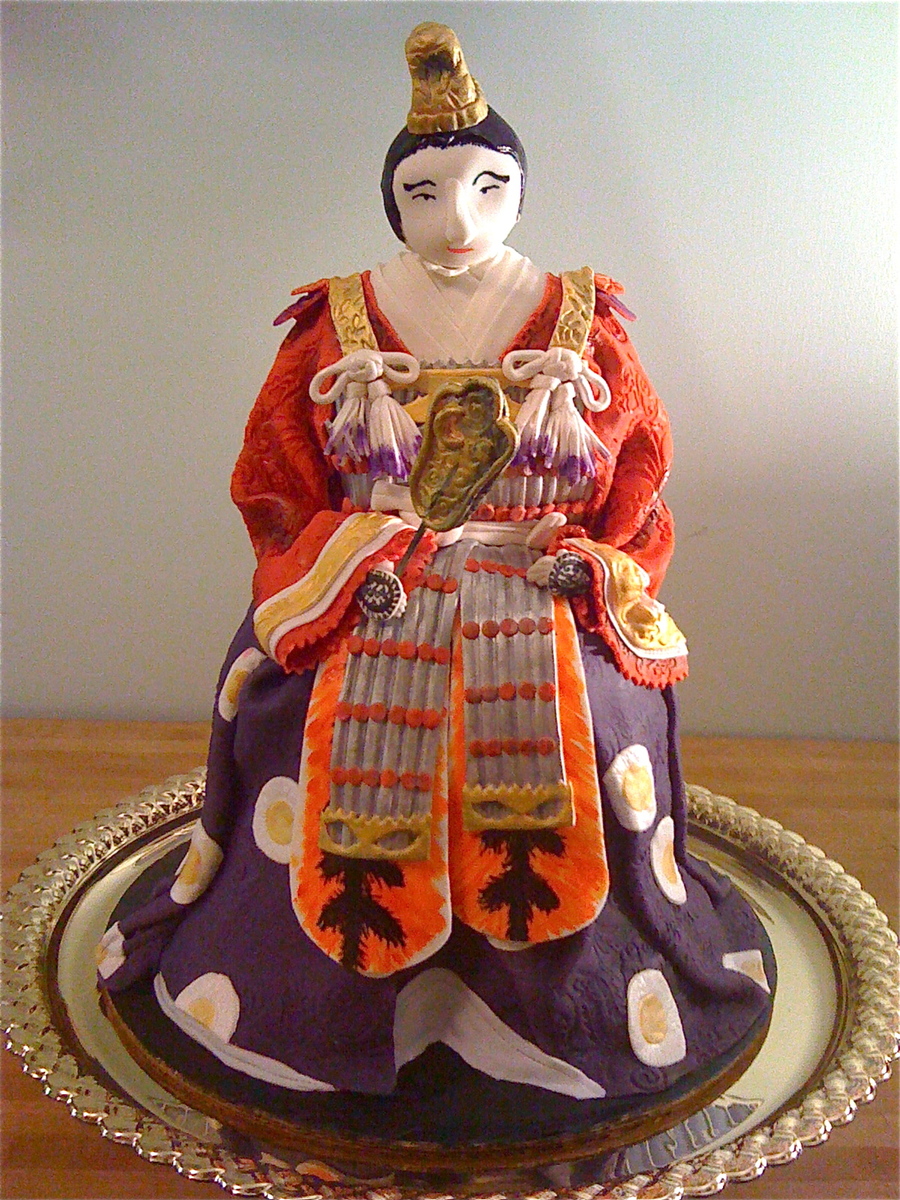 Samurai, spice cake with vanilla butter cream filling and chocolate fondant overlay. Everything is edible except the skewer for the shield. The top part of the body is rice crispy treat with fondant layers. The fondant is painted with luster dust and gel base coloring. Impressions were made in the fondant to simulate fabric as well as adding fondant "trim" overlay to enhance the fabric look. Enjoy!