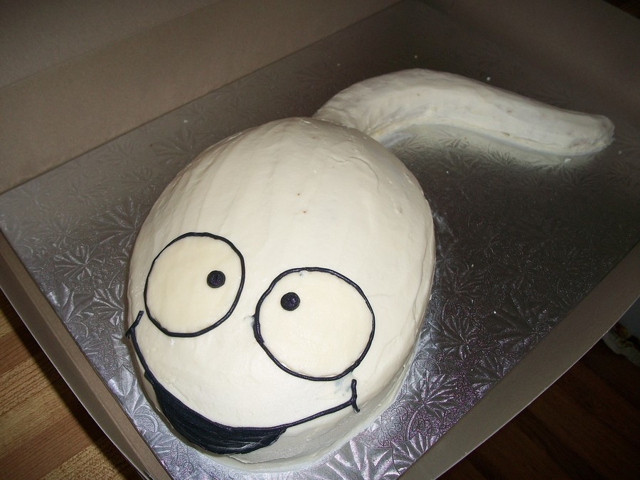 My cousin works at a fertility treatment centre. For her boss' birthday, she requested a sperm cake :) The 'head' is a 10" oval, Vanilla cake, Vanilla mousse filling (Of course! LOL), and I molded the tail out of RKT.