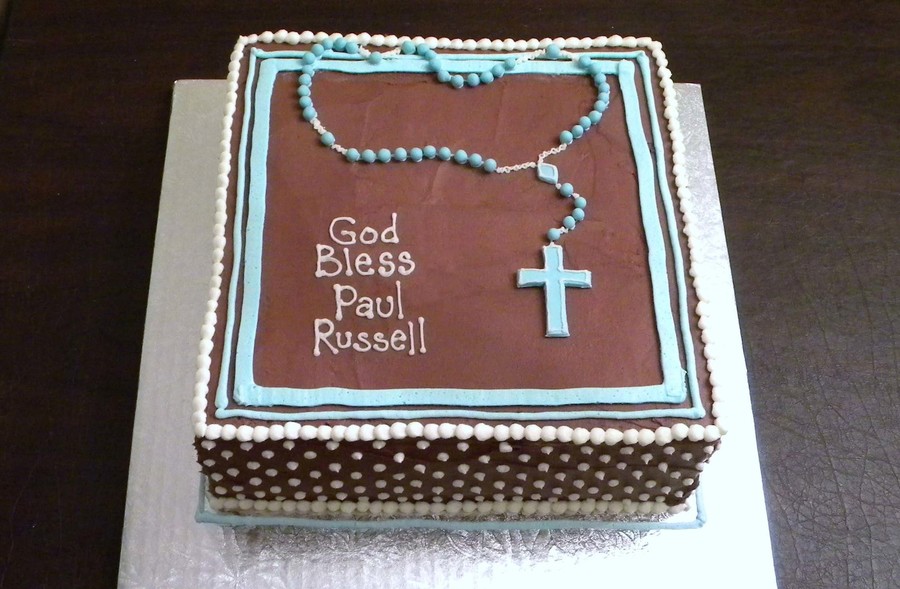 10" square. buttercream with fondant rosary beads.