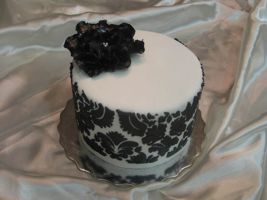 This is a 6 inch fondant covered cake with black damask stenciling topped with a black sugar fantasy flower. It was my first time using the stencils and they were a bit challenging to use, but overall very pleased with the results. Hope you like :)