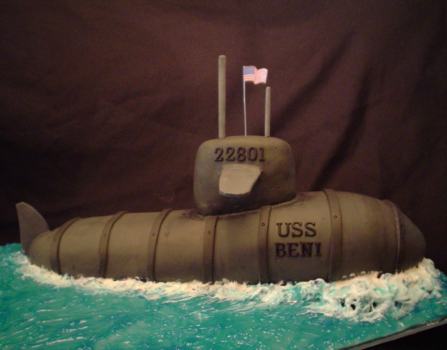 a Strawberry Lemonade Pound Cake with homemade strawberry preserve filling, covered in lemon buttercream and lemon fondant. Shaped like a submarine with the boy's name and actual birth date on it. The water is fondant, piping gell and royal icing.