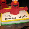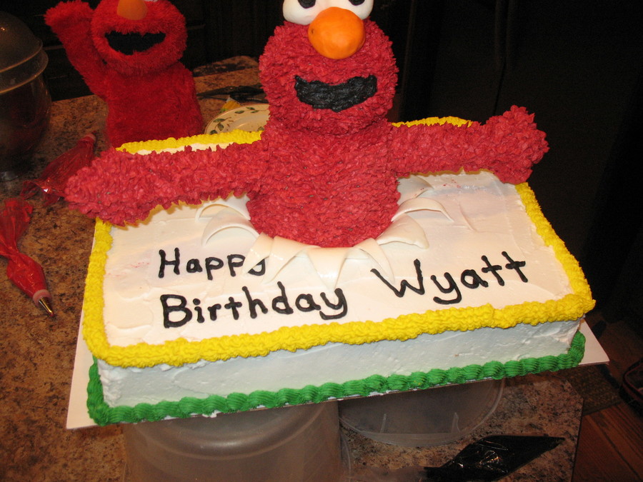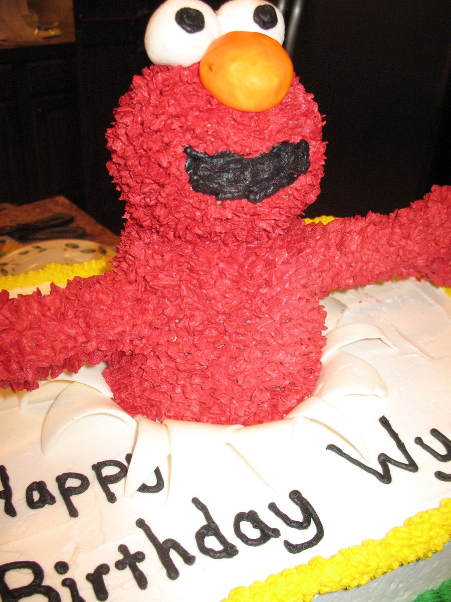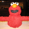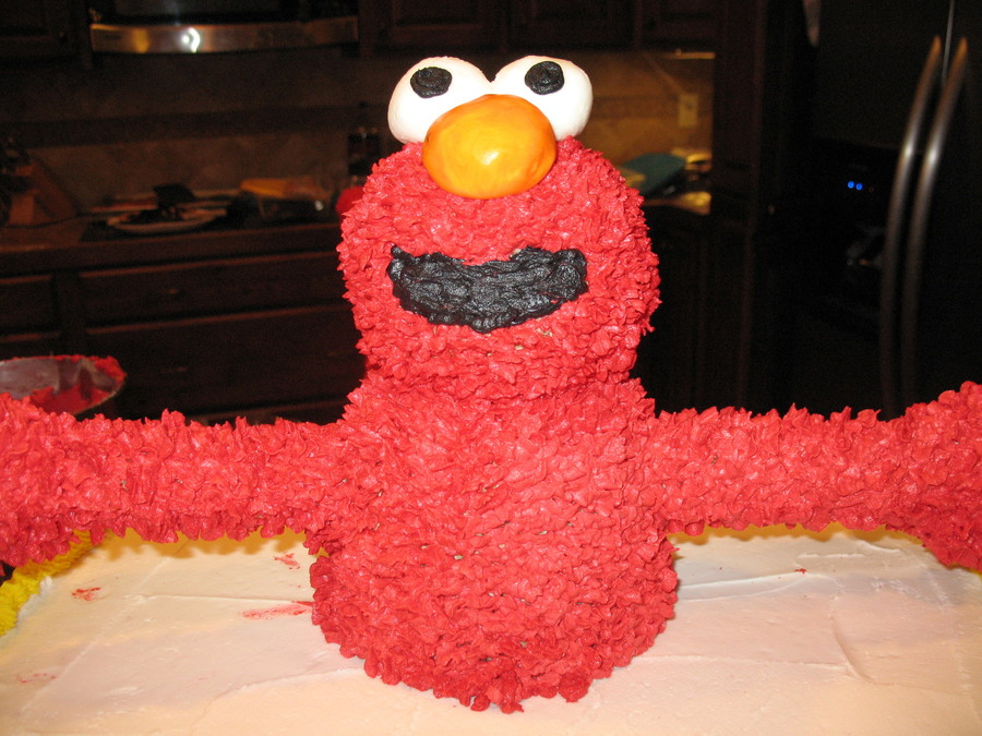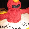 Inspiration from the many Elmo cakes that have already been done. I used buttercream frosting with mereguine powder to help stiffen it. I have included the unfrosted pics too of rice crispy treats dowels supported Elmo. (Well I tried to include that picture but the control freaks on the website won't allow step pictures and removed it.) The little boy who was 3 absolutely loved the cake.