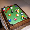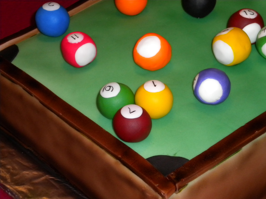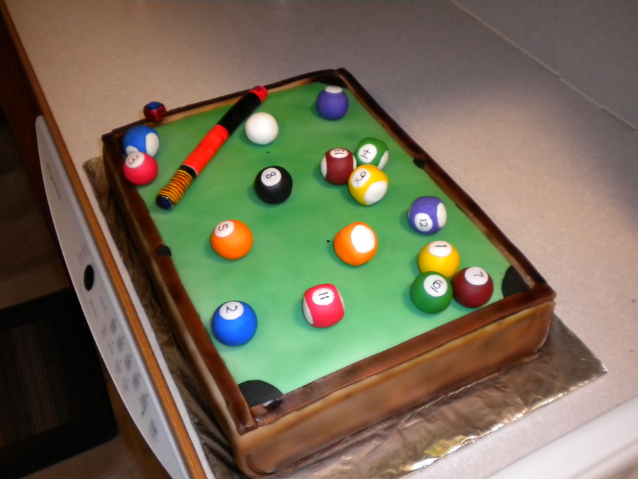30th Birthday Pool Table Cake - two layer sheet cake with icing & fondant. Pool balls are made out of jaw breakers covered in fondant. Numbers were hand painted with food coloring. The pool table was airbrushed. The caulk was made out of fondant, hand painted.