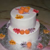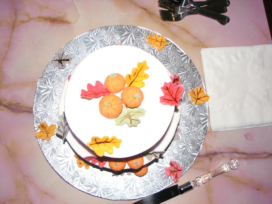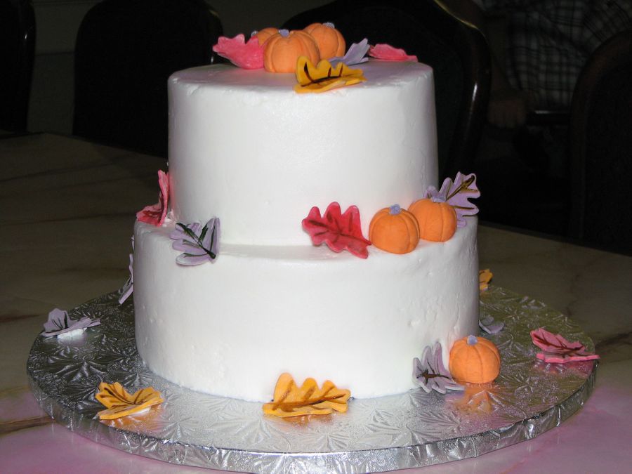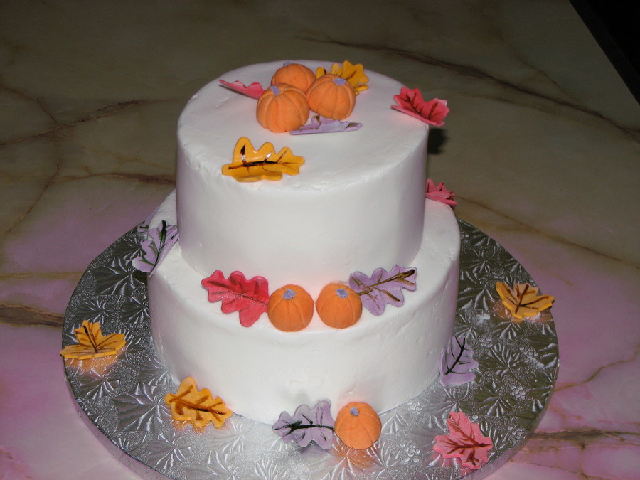 This was a sample cake I made for a taste testing. It was a two tiered apple cake with caramel BC with fondant leaves and pumpkins.