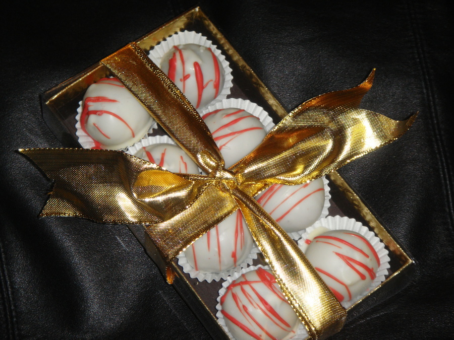 First cake truffle sale! Red velvet dipped in white choc. Used truffle boxes purchased from local candy/choc store-removed inserts.