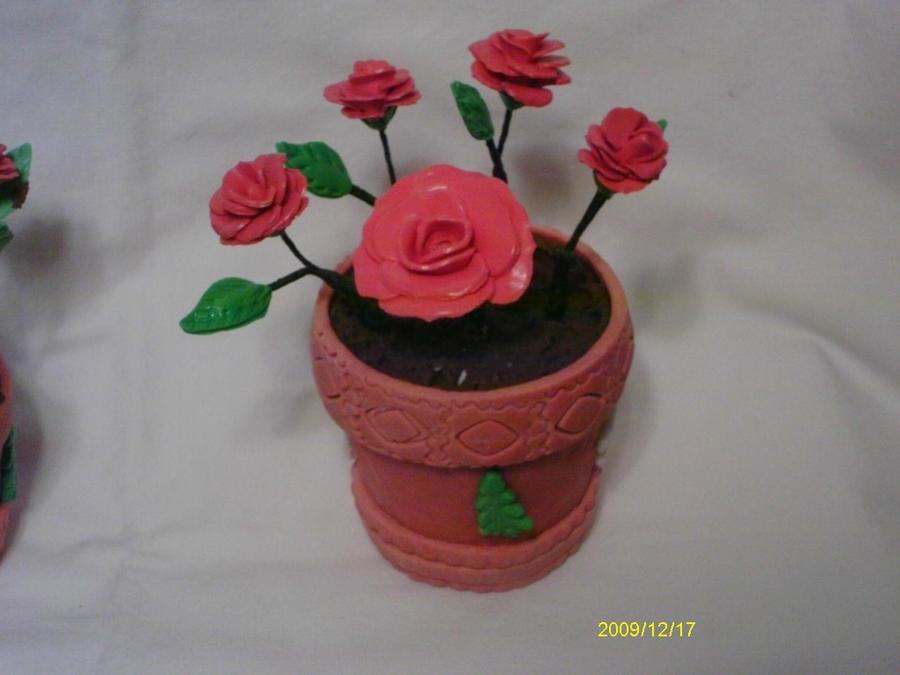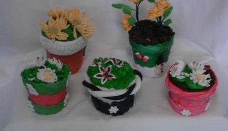 flower of gum paste base of pot made of fondant and oreo dirt and inside of pot chocolate candy.