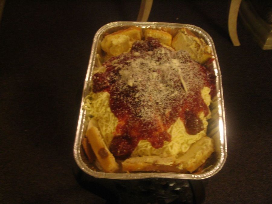 ok ok funny guys phoov it' spaghetti and bread with alot of butter.......aand of course the white chocolate for the cheese, thanks to those who made this cake before me...