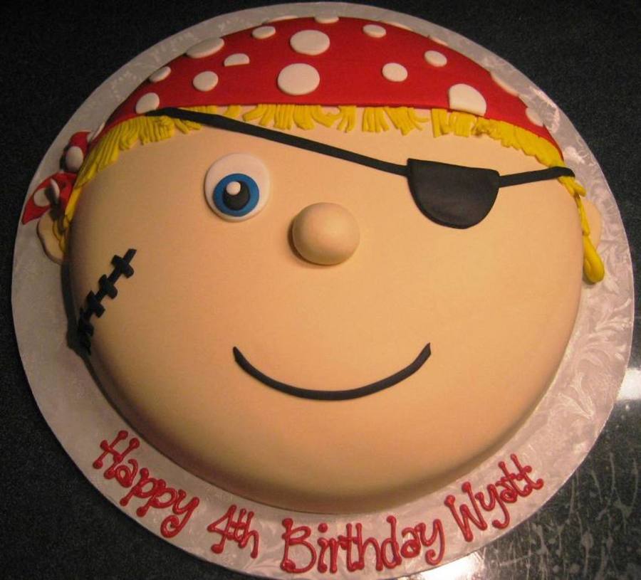 This cake was made for a boy's Pirate themed birthday cake. Ideas came from cakechic77 plus others on CC. A fun cake for little boys and could be easily made with girl features. I used a 14" round cake pan for this cake, and I left on the "hump" on the top and cut off the edges to make a smooth edge for the face - could easily be made using smaller round pans to cut down on serving size.