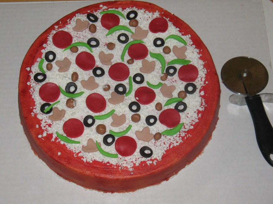 I was dying to try the White Velvet Cake recipe I found on here.(posted by CakeMommyTX) so I decided to put it in a 12" pan and make that pizza cake, I have wanted to do. This was so fun! Iced in BC Airbrushed the crust and sauce, the cheese is shaved almond bark and the pep, gpep, mush, saus.,and olives are all MMF. I haven't had the cake yet but the batter was amazing! I am skipping out on my diet and having some after dinner! Thanks for sharing the recipe CakeMommyTX!