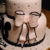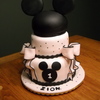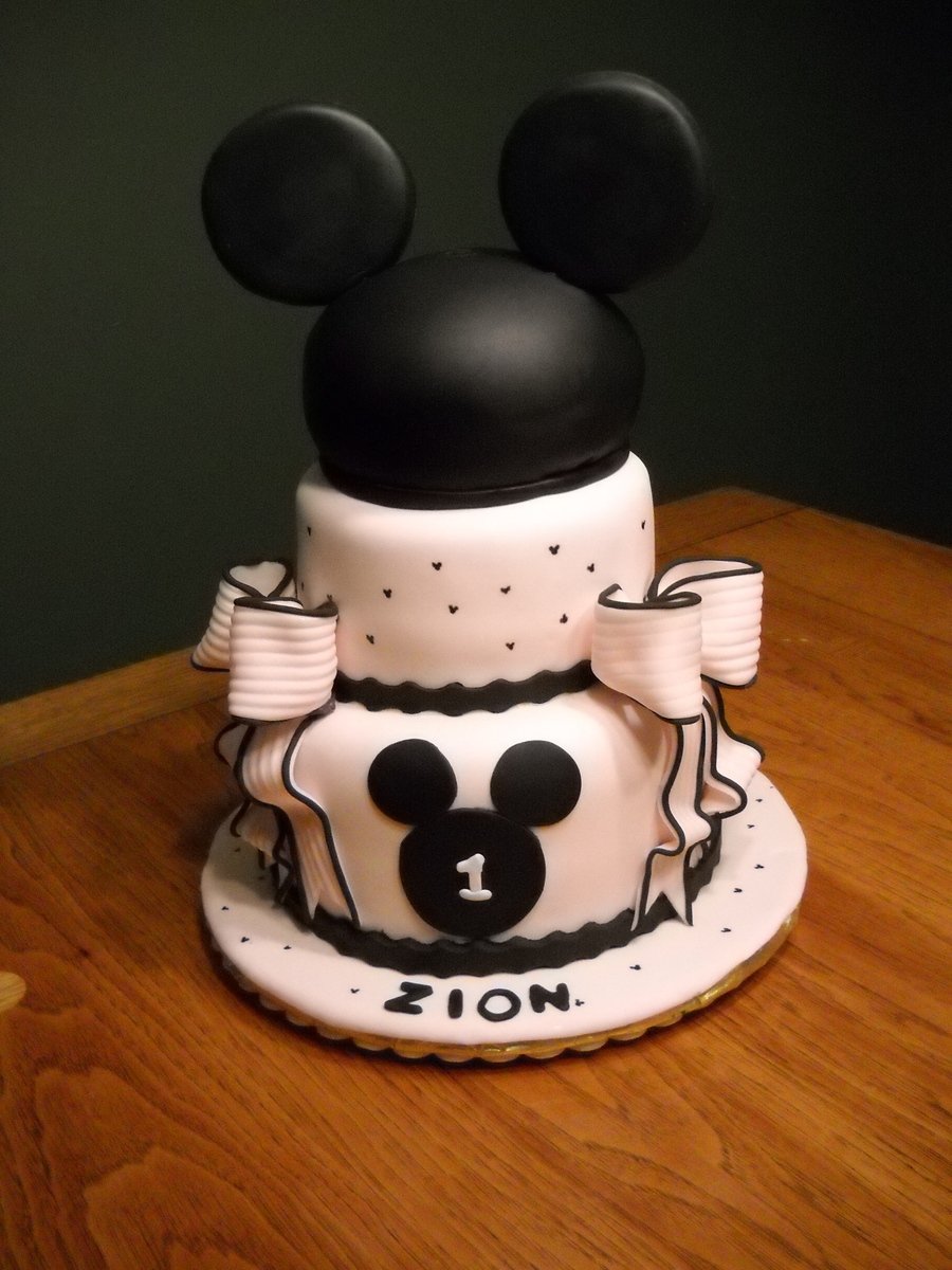 Birthday cake for a 1 year old female who LOVES Mickey. I tried to make it look feminine . fondant decorations. Mickey silhouettes drawn with an edible marker.