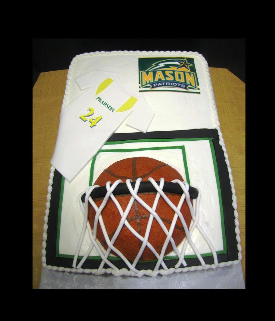 Birthday cake for college basketball player. 1 side of sheet is white cake with straberry and pineapple filling, side with basketball is devils food cake with chocolate creme filling , basketball is red velvet cake.. Buttercream frosting with fondant. Parents are travelling to Virginia to take the cake for his birthday