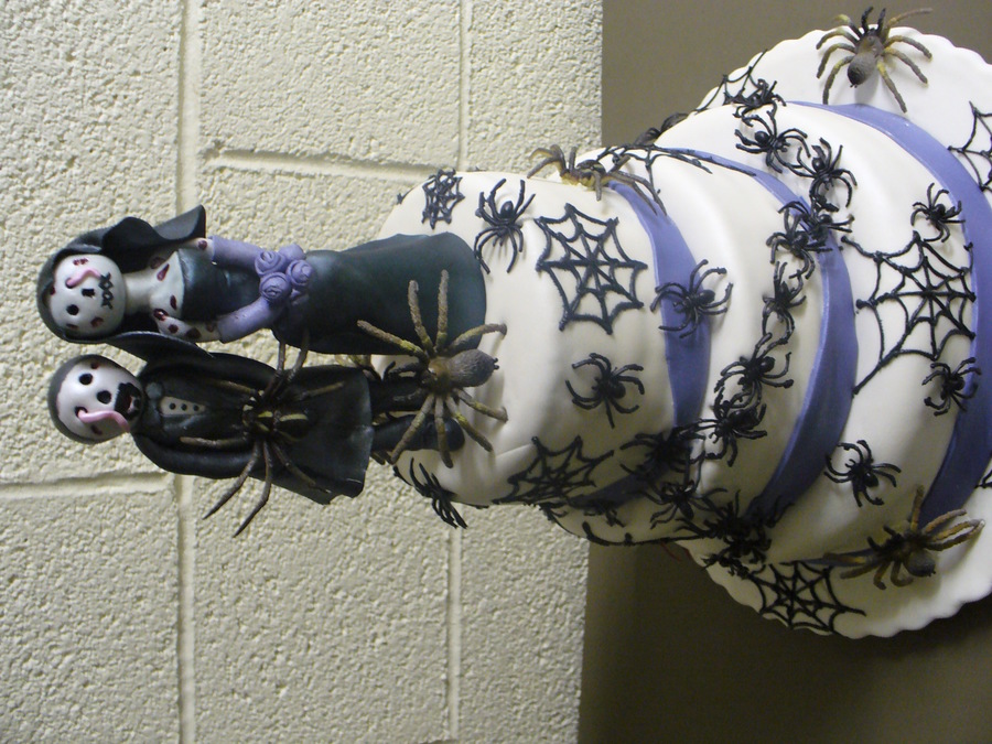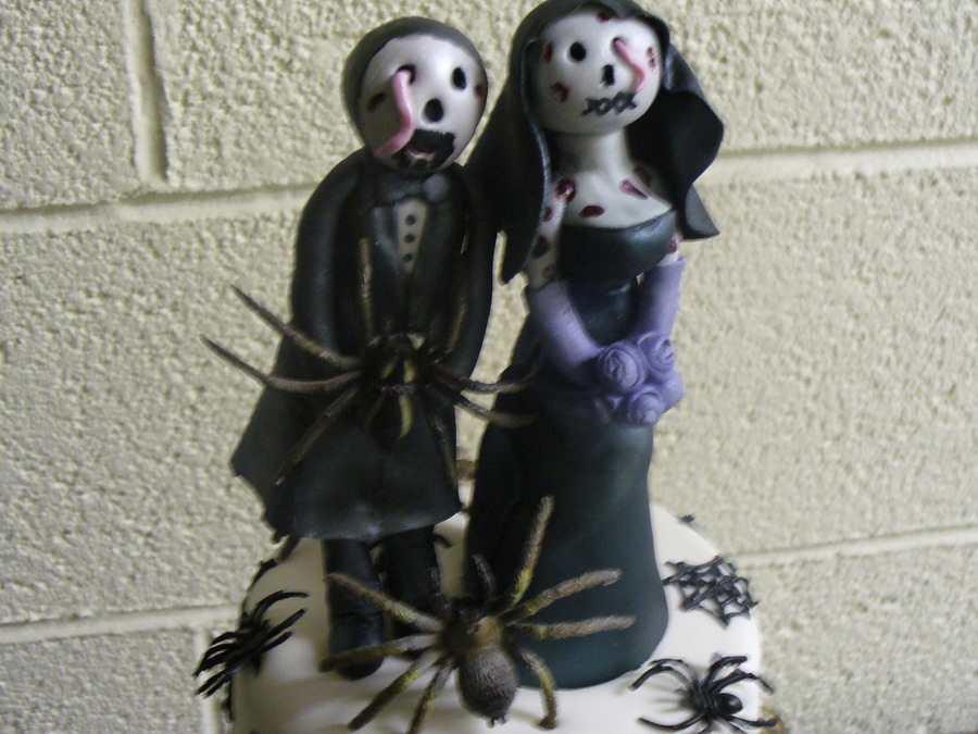 A couple was getting married on Halloween. They wanted a traditional wedding cake with Halloween elements!! The toppers are hand made with gum paste.