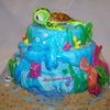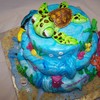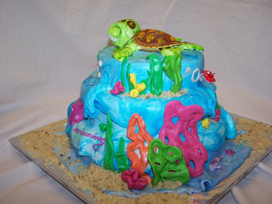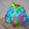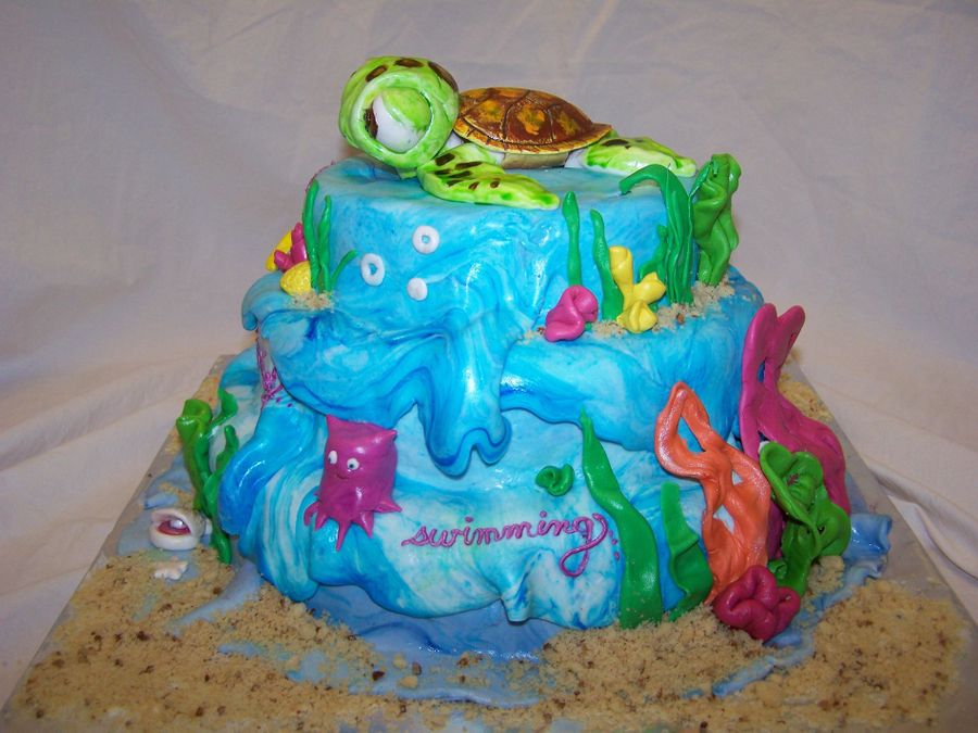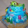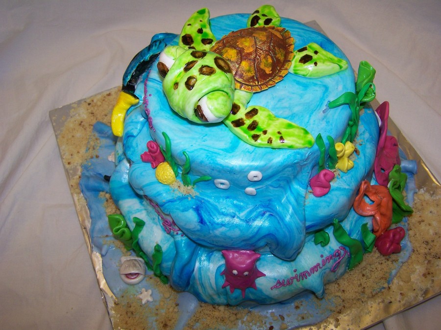This cake took a little while to mold and paint all the figures out of fondant, but it was well worth it. It was covered with fondant that was tinted with blue that wansn't mixed in all the way to give it the wave look. The only not edible part is the turtle shell, but next time I'll make it out of chocolate.
