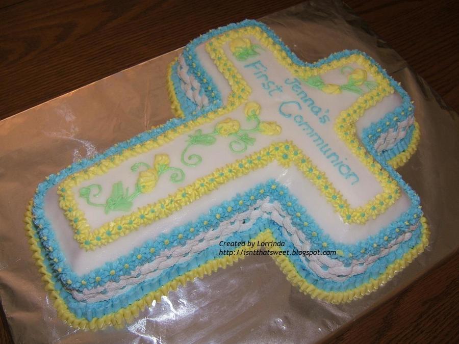 Made for my son's 1st communion. Fondant base and dove, bc piping.