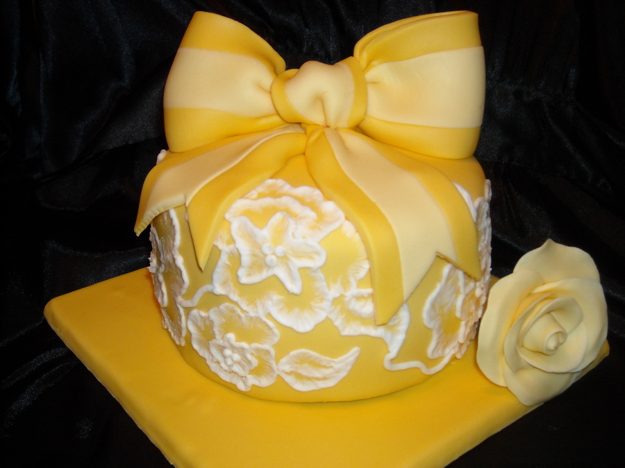 6 inch cakes covered in white chocolate marshmellow fondant. Flowers around the sides of the cake through brush embroidery. Fondant bow and rose. I made this for my good friend's 21st birthday. Thanks for checking it out!