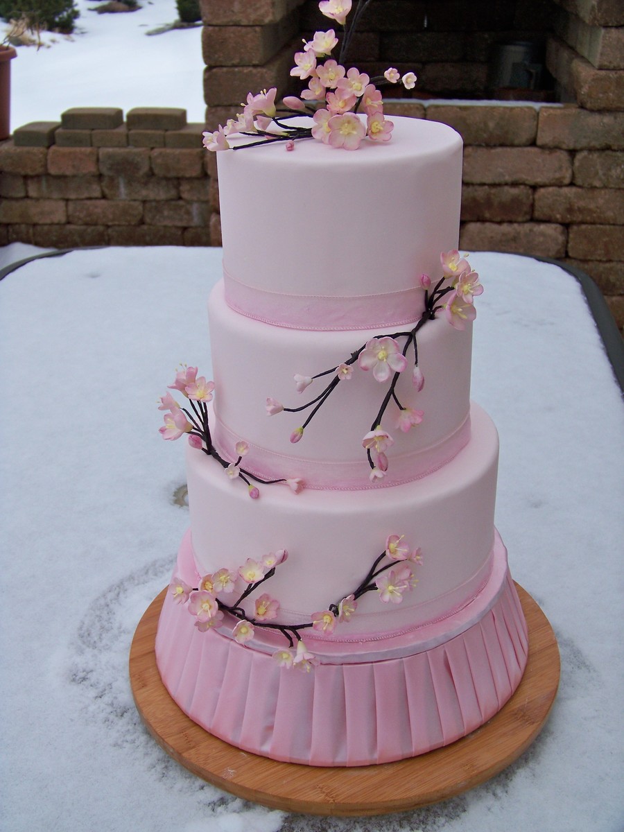Pale pink fondant covered dummy cake, 6, 7 & 9 inch round layers. Decorated with fabric ribbon at the base of each layer and hand made cherry blossoms. the design was inspired by a cake photo in the Martha Stewart Wedding Cake book.