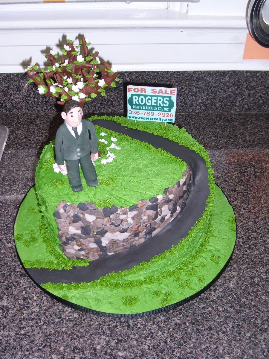 This was done for a real estate agent. It's a 10'' round carved and covered in buttercream. The tree is modeling chocolate, the man is gumpaste, and the sign is gumpaste with an edible image. Thanks for looking.