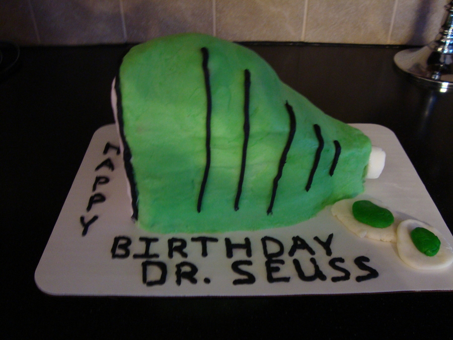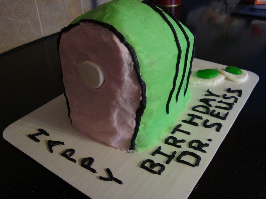 Vanilla cake tinted green and iced with buttercream. Eggs are gumpaste and fondant. Only my second carved cake made for a class of first graders to celebrate Dr. Seuss' birthday. Thanks to those ahead of me for inspiration and DH who sliced off most of the back end when I was scared to! LOL!