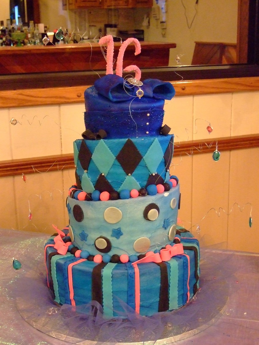 Sweet 16 topsy turvy . Airbrushed blue, fondant covered top tier , fondant accents. gumpaste number topper. Thanks for looking!!