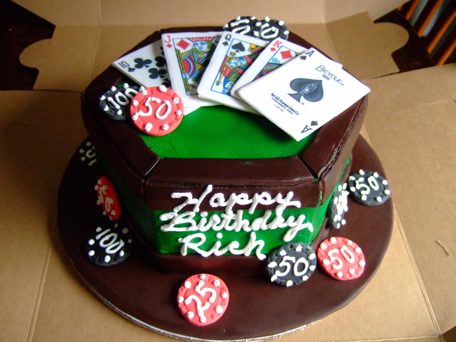 poker table. airbrushed with fondant accents. Playing cards are edible images on gumpaste.