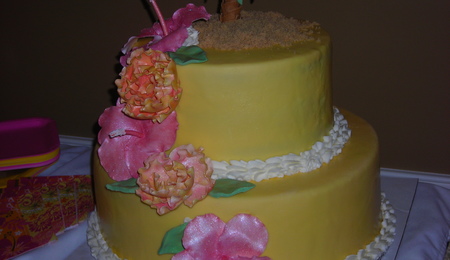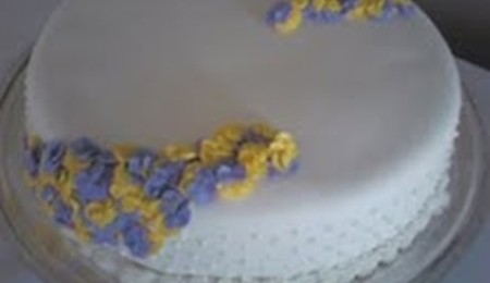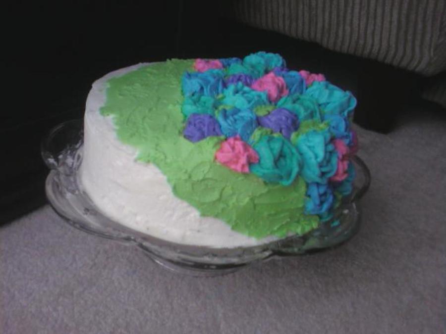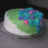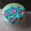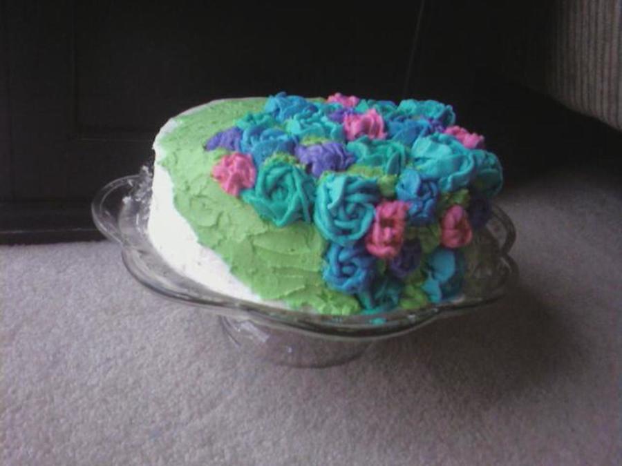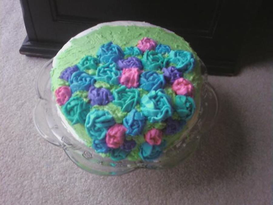 Rich chocolate cake covered in buttercream icing. The flowers are also made of colored buttercream (rose, violet, sky blue, royal blue, and teal colored)