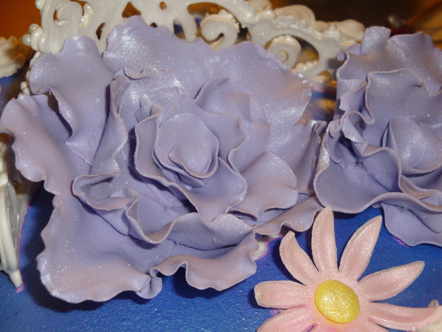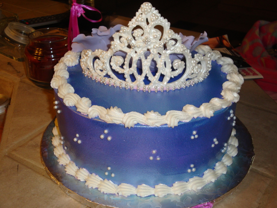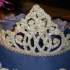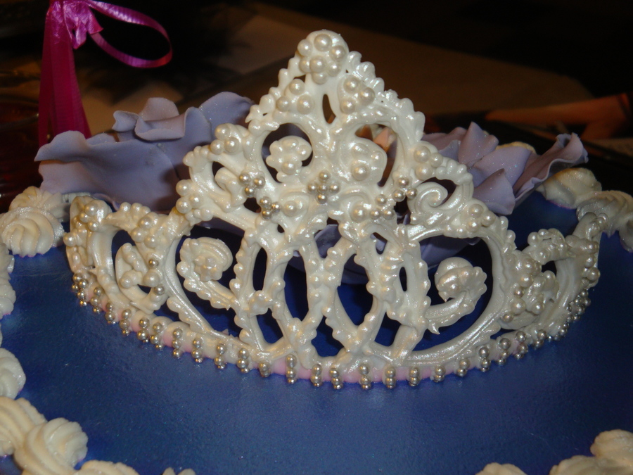 Royal icing tiara with sugar pearls. Airbrushed with amerimist lavender pearl color. Gumpaste fantasy flowers