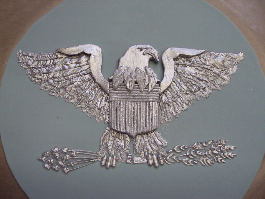This eagle was hand done using royal icing. The main body was fondant. It went on the top of a cake at a Colonel's retirement party.