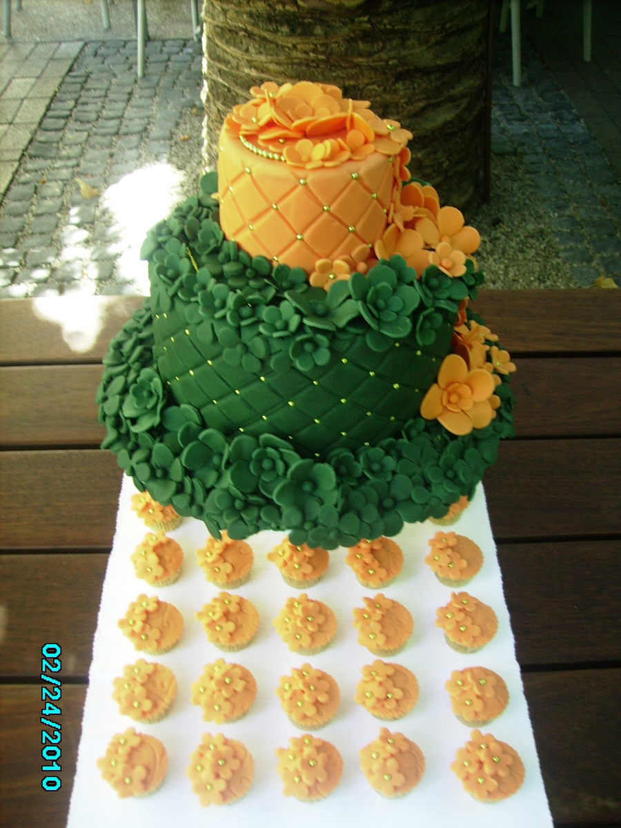2 Tier Wedding cake - colours to match Brides Outfit....plus 3 dozen mini cupakes. Wedding Reception held in Reception Venue's Garden Area - on a a very hot and humid Australian day.....41C = 112F. Bluehue