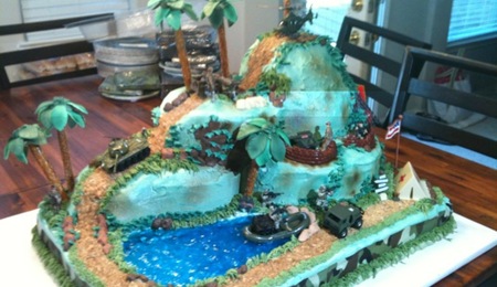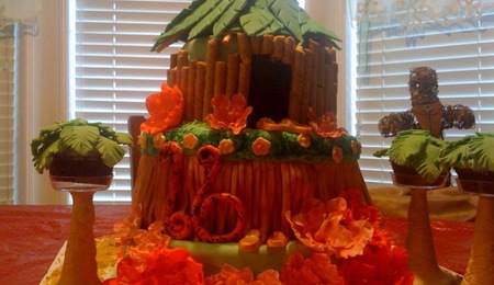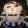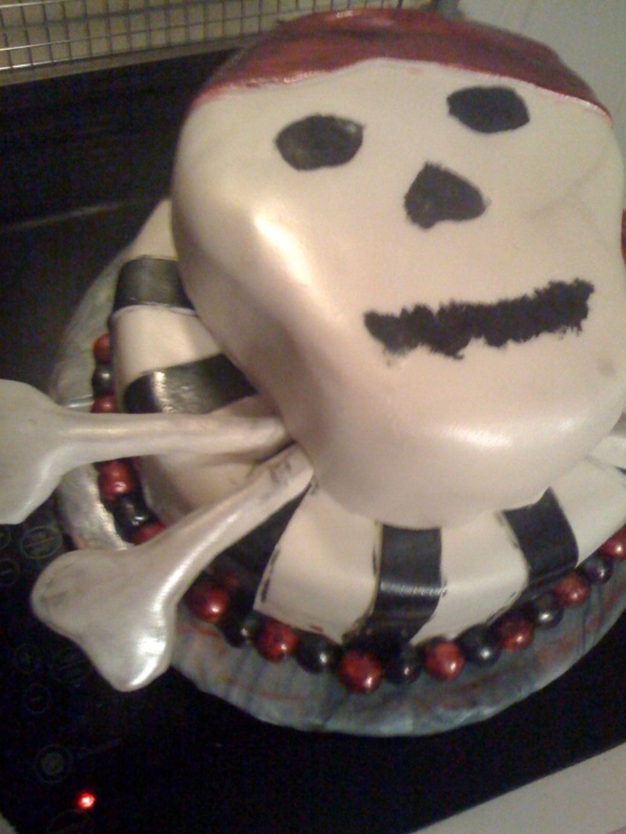 Fondant covered cake. Top layer was carved and covered with fondant to look like a skull. All color was hand painted and then airbrushed for accents.