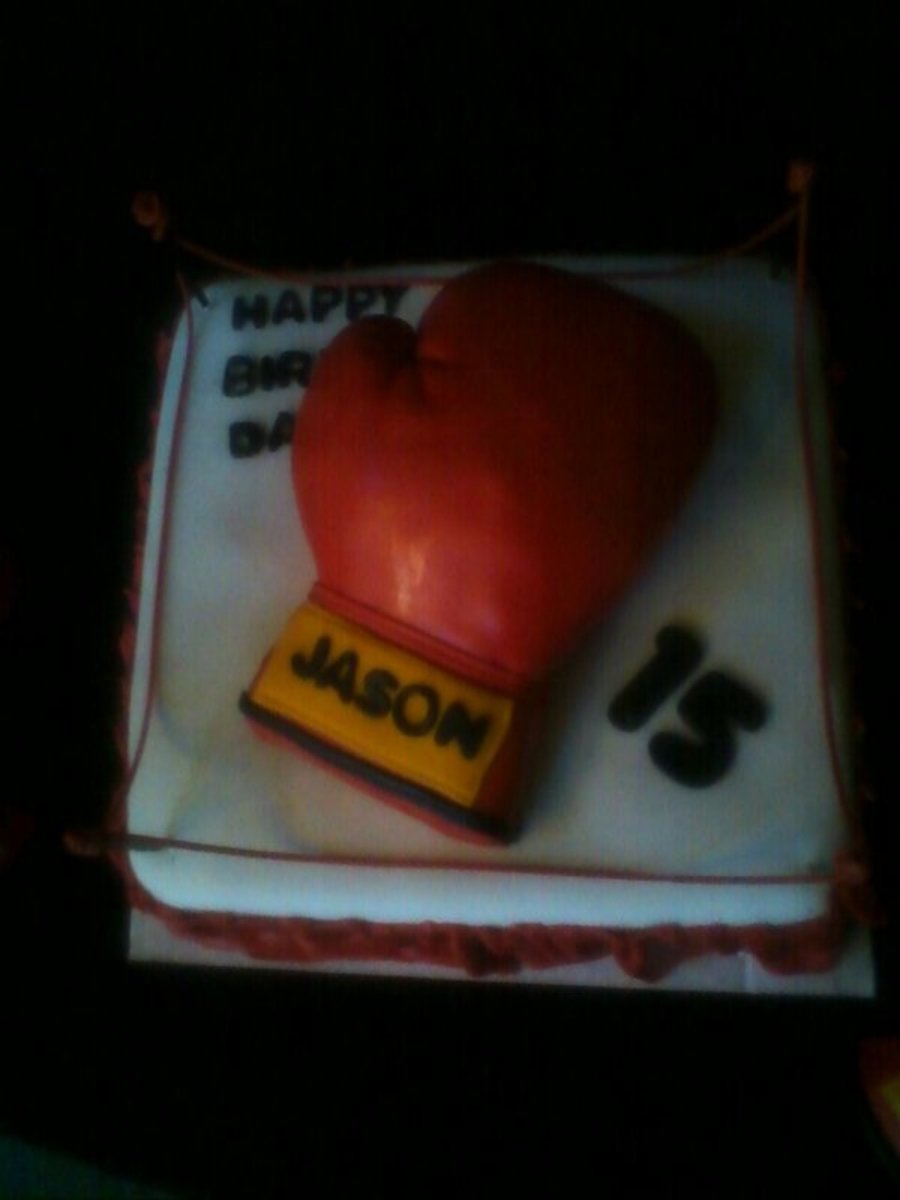 I carved boxing glove froma double layer 8inch square cake,frosted & fondant.Boxing ring was made from a 12inch double layer,white fondant using red for curtain like look around the ring,cookie sticks painted w/black color gel w/red gunpaste for the posts & rope,I should have just used like a thin licorice for rope,the gumpaste kept breaking...
