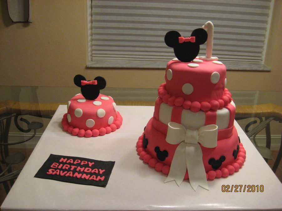 This was a fun, fun cake! I made it for my niece's 1st birthday. Thanks, aprilsong, for the idea! I tweeked it with a few of my own ideas. Had to change some of the things I wanted to do b/c the fondant I got was not cooperating. I usually make my own mmf but due to a shoulder injury I wasn't able to. I must say, I MUCH prefer to use homemade mmf over store bought. The cakes were pound cake w/strawberry bc and strawberry filling covered in fondant. The Minnie cutouts and #1 all fondant.