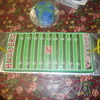 Half chocolate, half vanilla cake covered in green fondant. Alternated light and dark green fondant stripes for the field. Buttercream details. Gumpaste goal posts.