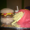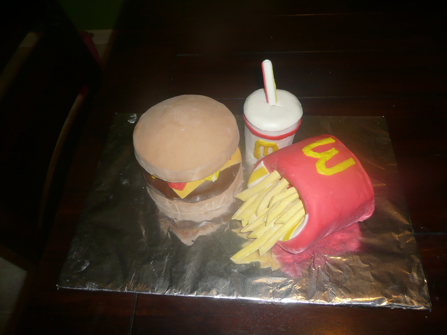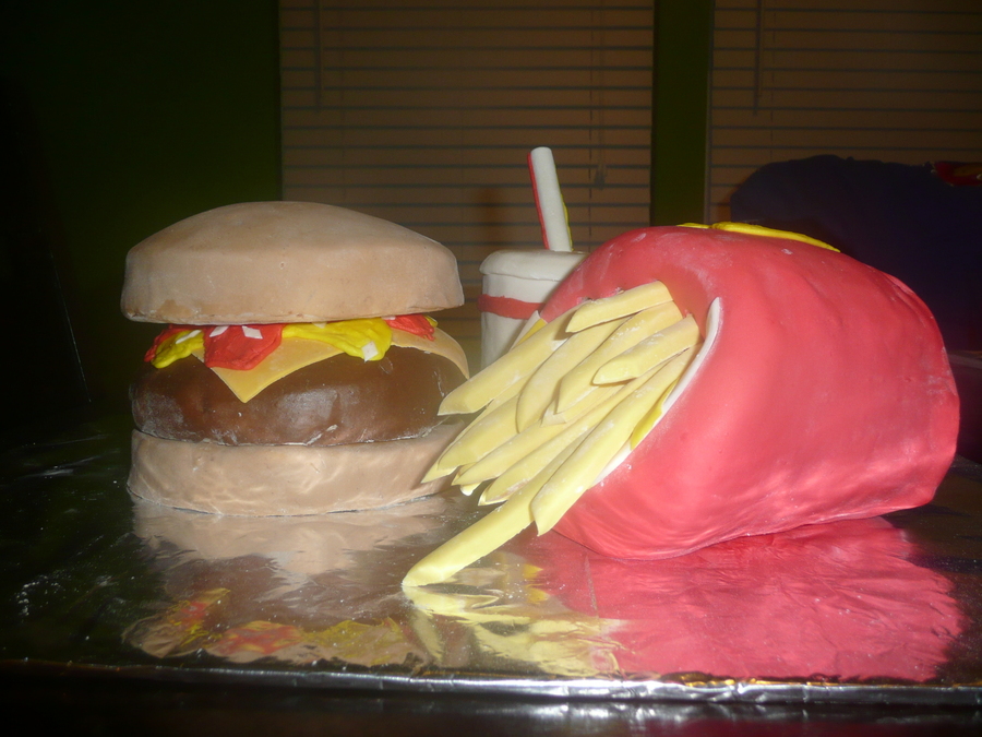 Cheeseburger and fries made out of cake, covored in MMF. Fries are thick slices of MMF. Drink is RKT covored in MMF. Buttercream details. My boss gave up fast food for new years so for her birthday (just 3 weeks later) I made her this. HUGE hit at the office!