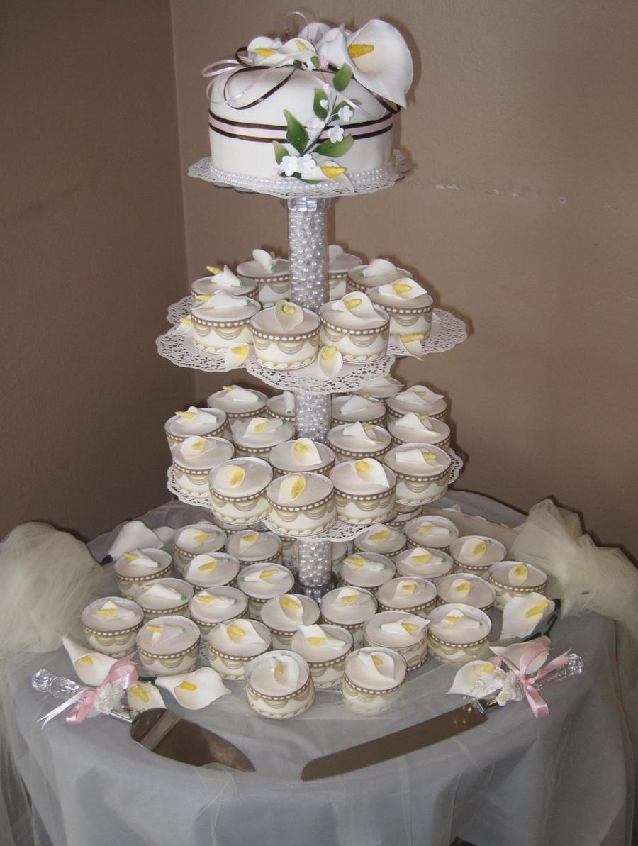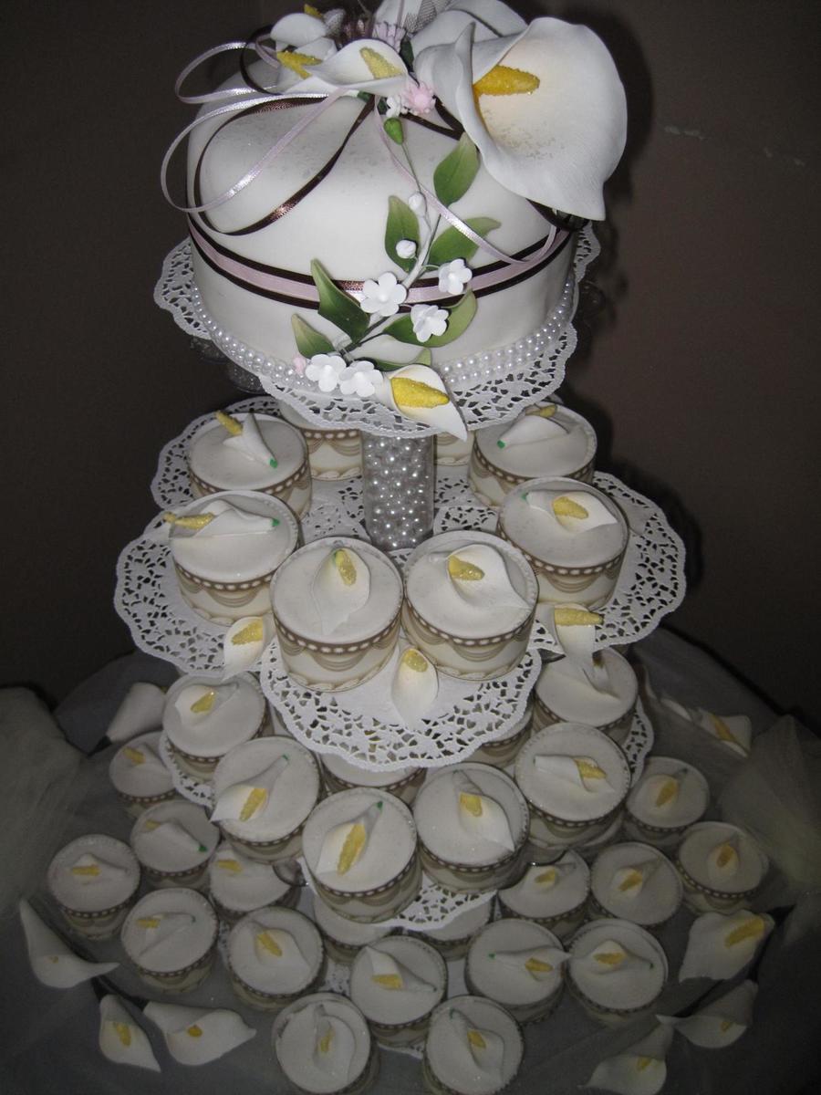 Wedding cake and cupcakes for a friend, fondant, cala lilies were made from fumpaste