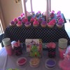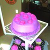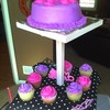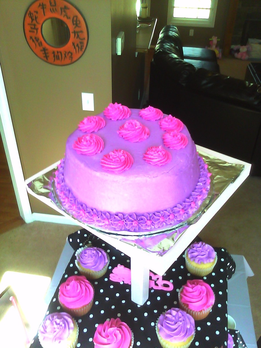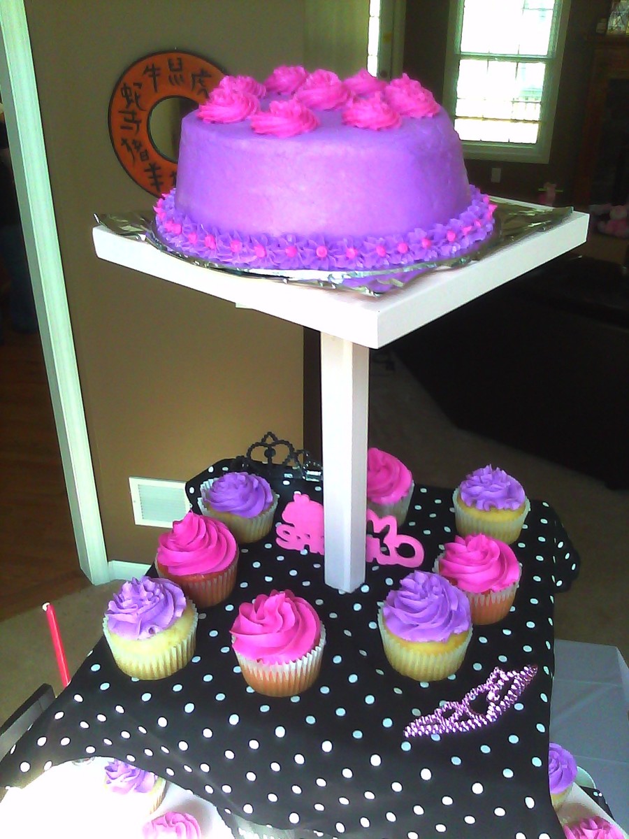 My friends dad built this cupcake tower for her daughter's 1st birthday. I decorated a personal cake for her and placed it on the top tier and the bottom tiers have cupcakes with pink and purple frosting.