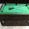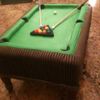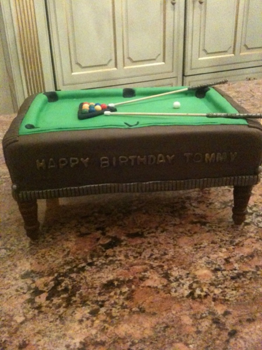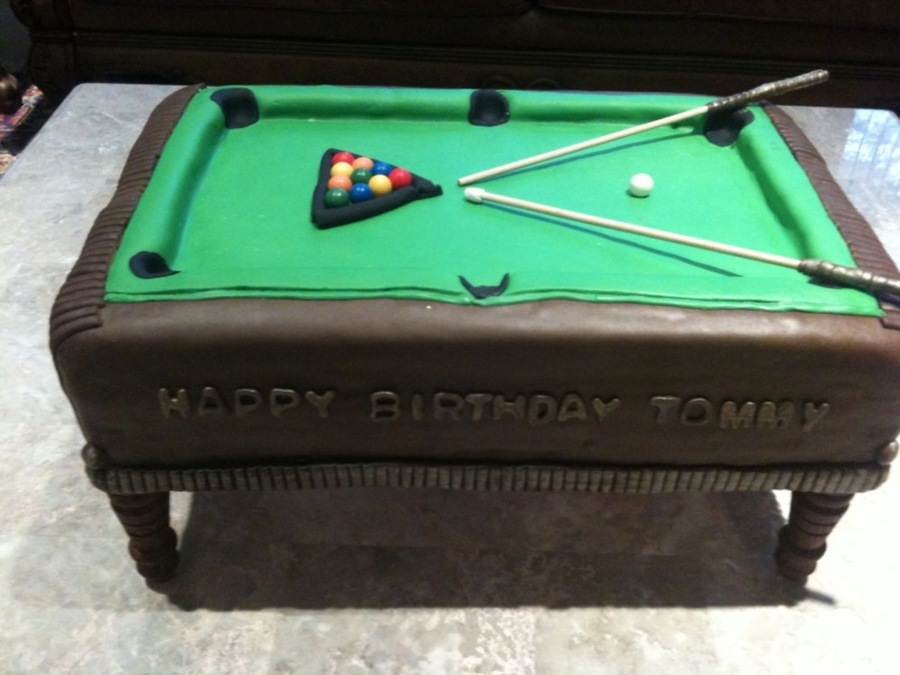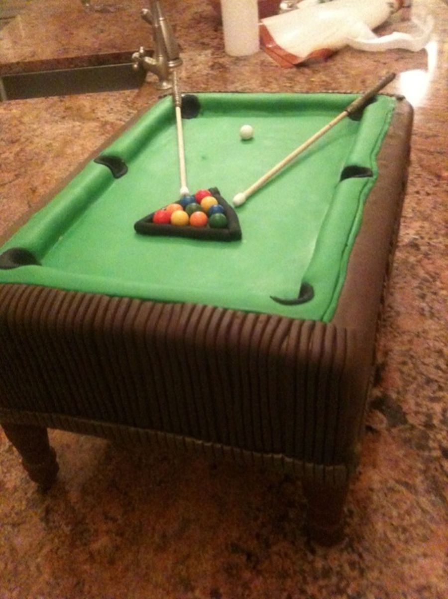 12" x 18" rectangle cake with 3 - 2" cake layers. Wood base with legs (you can get from the hardware store) pool sticks are wood dowels, and gum balls. Green & brown mmf with green cake layers. This was easy for me to make, this is my forst pool table cake for my 11 y/o son. This would make a great cake for grooms cake, Father's Day...