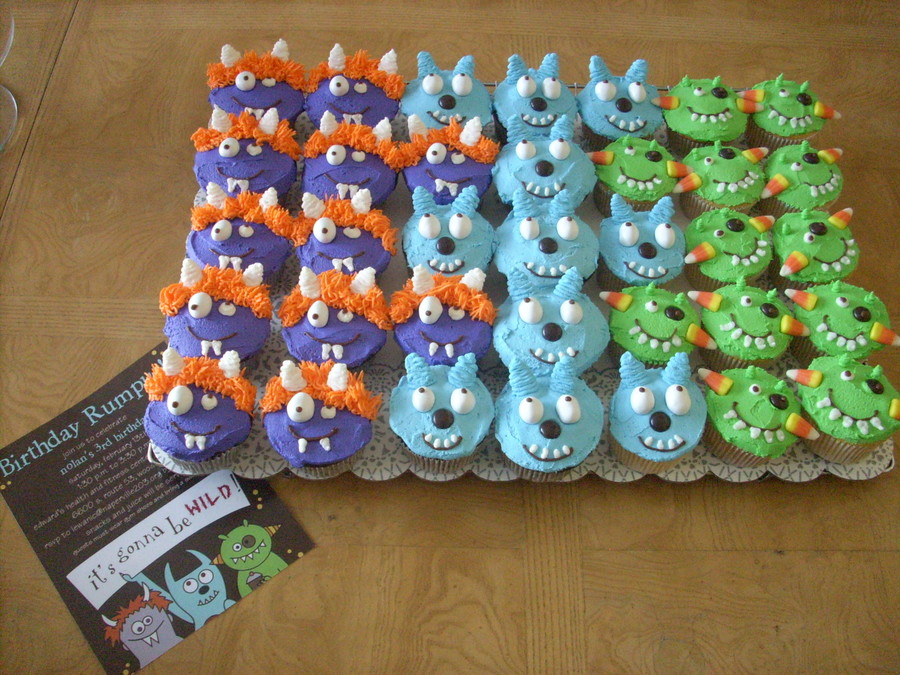 Cupcake monsters to match the invite. Buttercream frosting, white peanut m&m's for eyes, reese peices for the brown eyes, and candy corn for the horns.