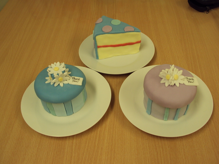Two thank you cakes for my mentors and one for my flat and I made from leftovers!! :D All vanilla sponge with raspberry jam and buttercream filling covered in fondant.