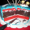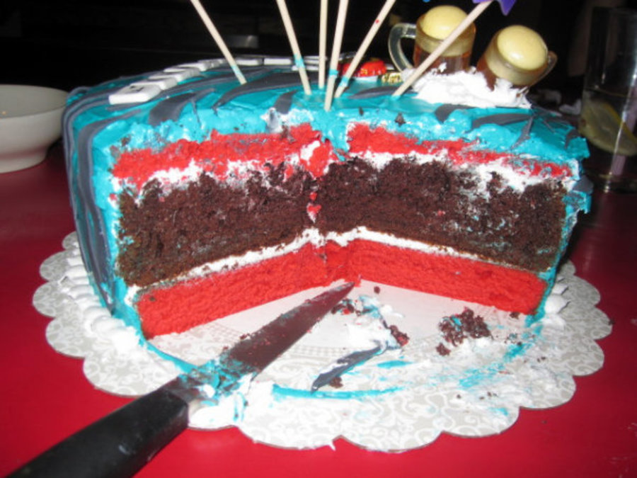 Red velvet and chocolate cake with cream cheese whipped icing.