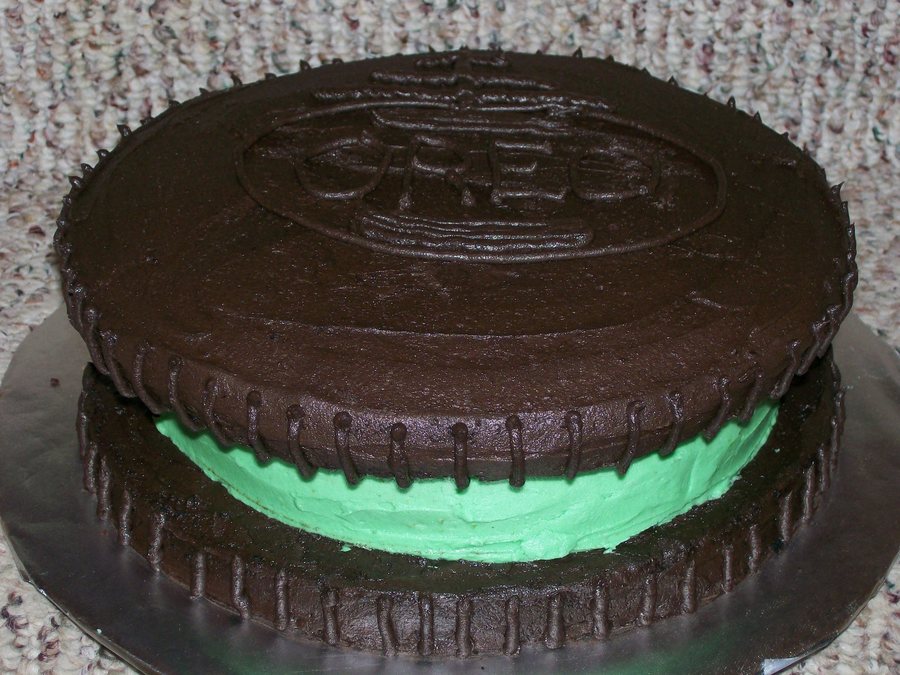Decided to try my hand at the oreo cookie cake. I decided to make mine mint. The "cookie" is chocolate cake with mint oreo pieces baked in and dark chocolate frosting. The "filling" is a white cake with mint frosting.