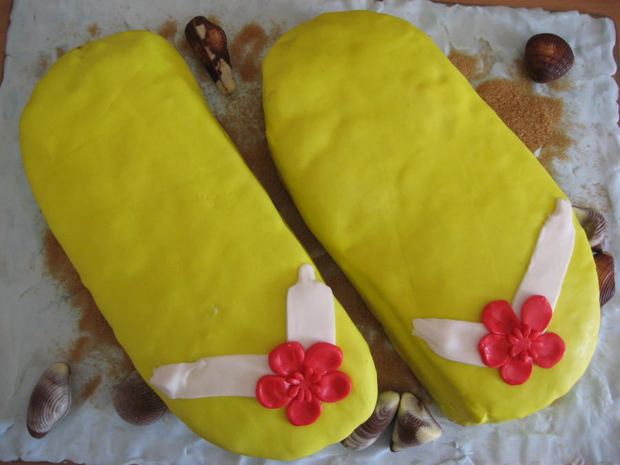 Summer feeling for an autumn birthday.. I covered the glas plate with blue fondant, used brown sugar as sand and some chocolate shells for decoration. For the cake I made two round pan cakes, and cut them into the form of flip flops...
