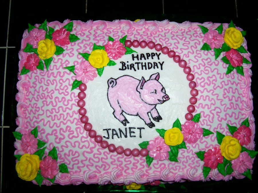 1/2 sheet covered in buttercream. Cornelli Lace, a combination of buttercream/royal icing flowers, white chocolate rolled pearls dusted with pink luster dust and a pretty pink pig round out this great pig-lovers cake!
