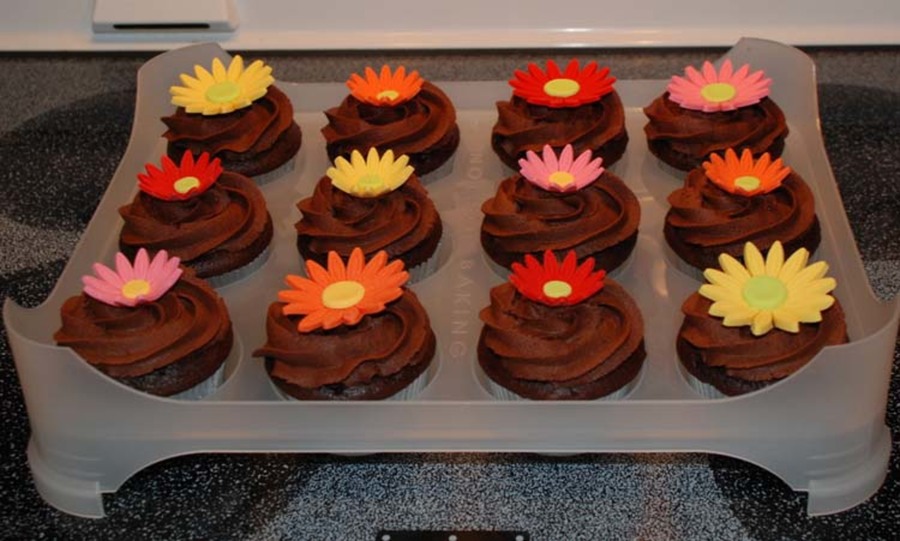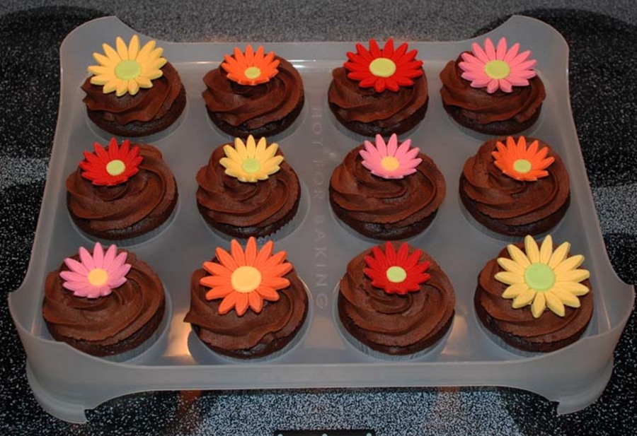 These are chocolate cupcakes made from the Darn Good Chocolate Cake recipe with chocolate buttercream and white cake cupcakes with classic buttercream. These daisies are fondant.